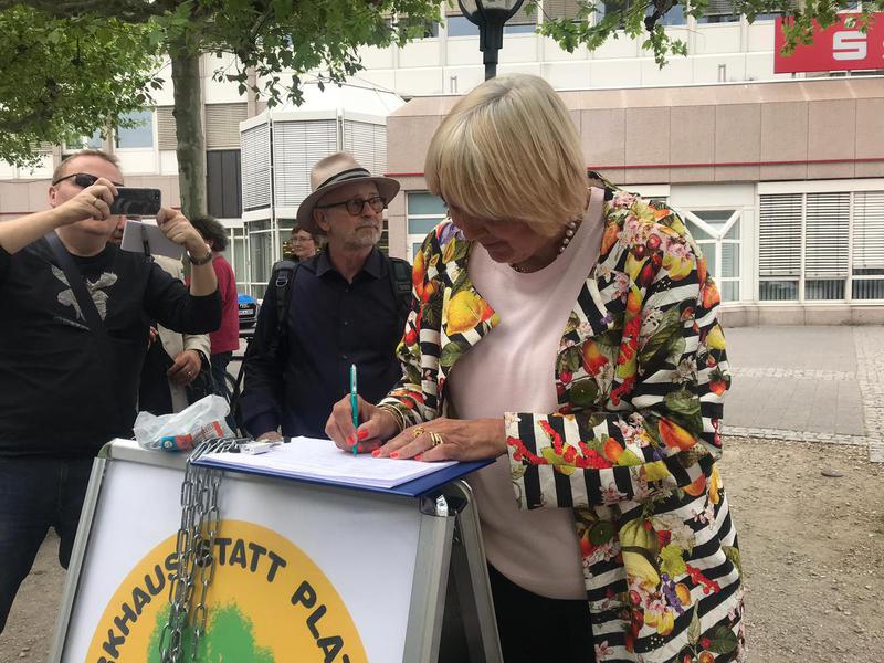 Jetzt ging es auf den Platanenhain, wo sich Claudia in die Liste der Unterzeichner gegen das dort geplante Parkhaus eintrug. Mit sichtlicher Empörung meinte sie nur: „Sind die denn narrisch geworden, die schönen Bäume abzuholzen?“